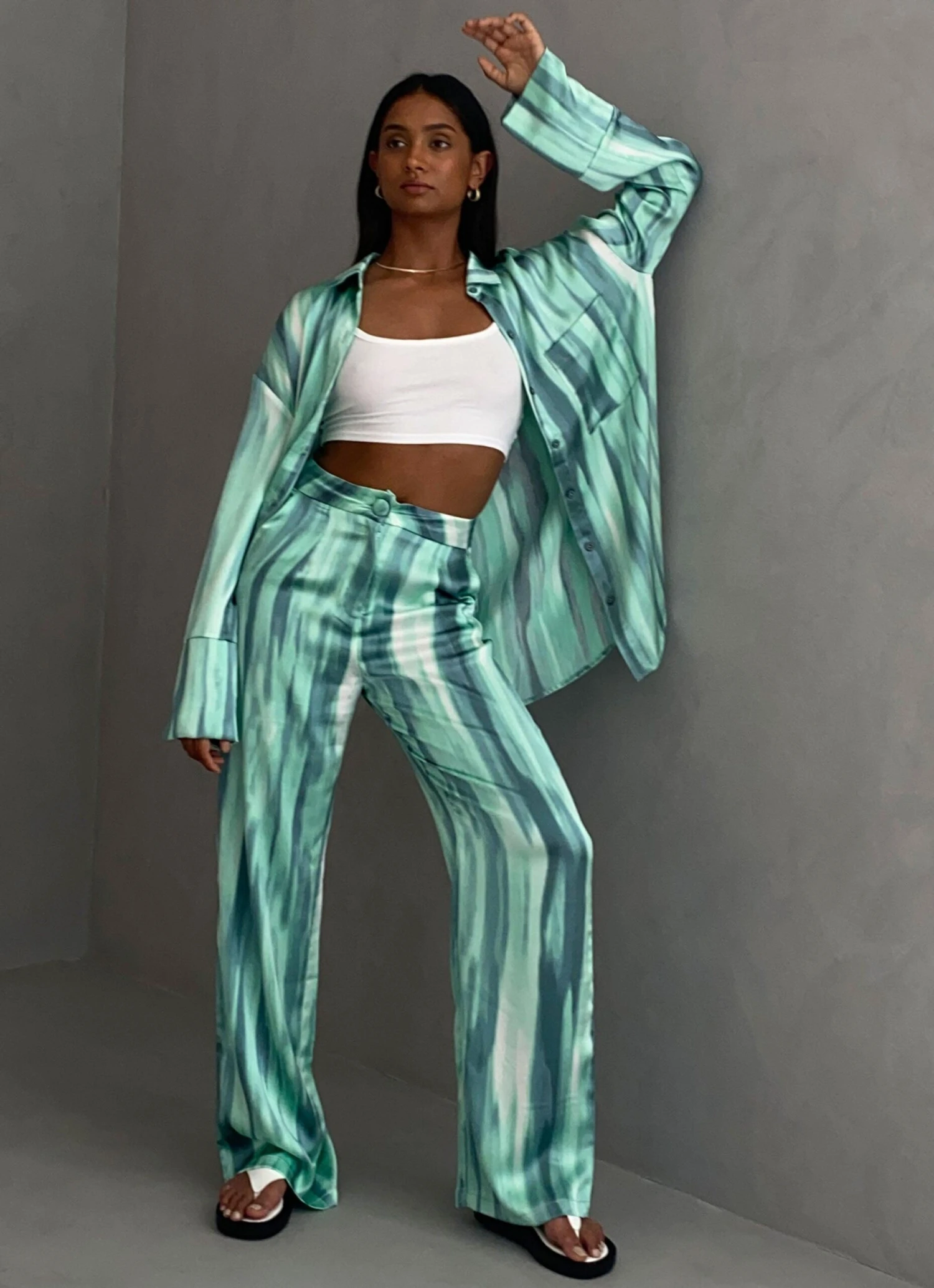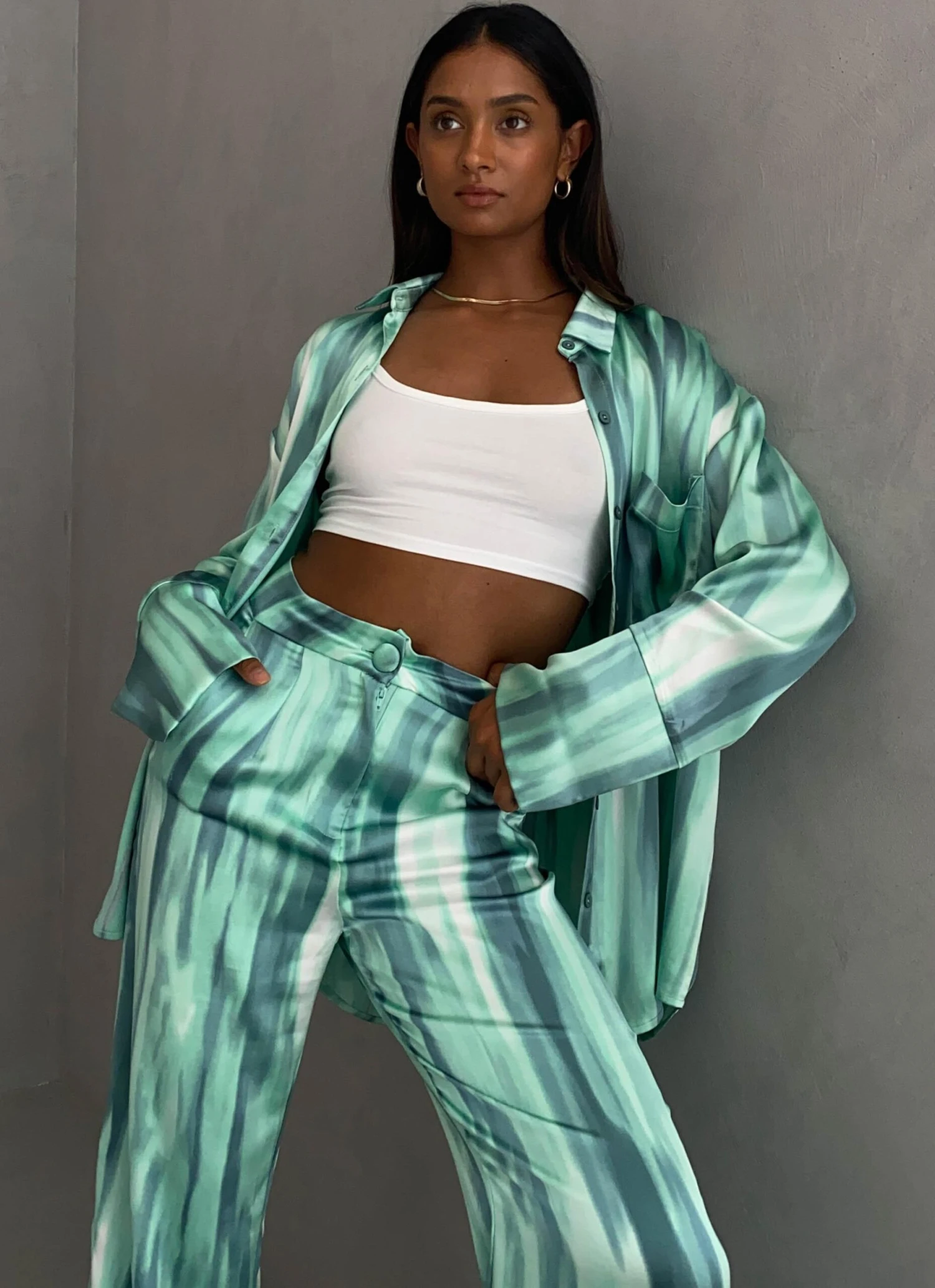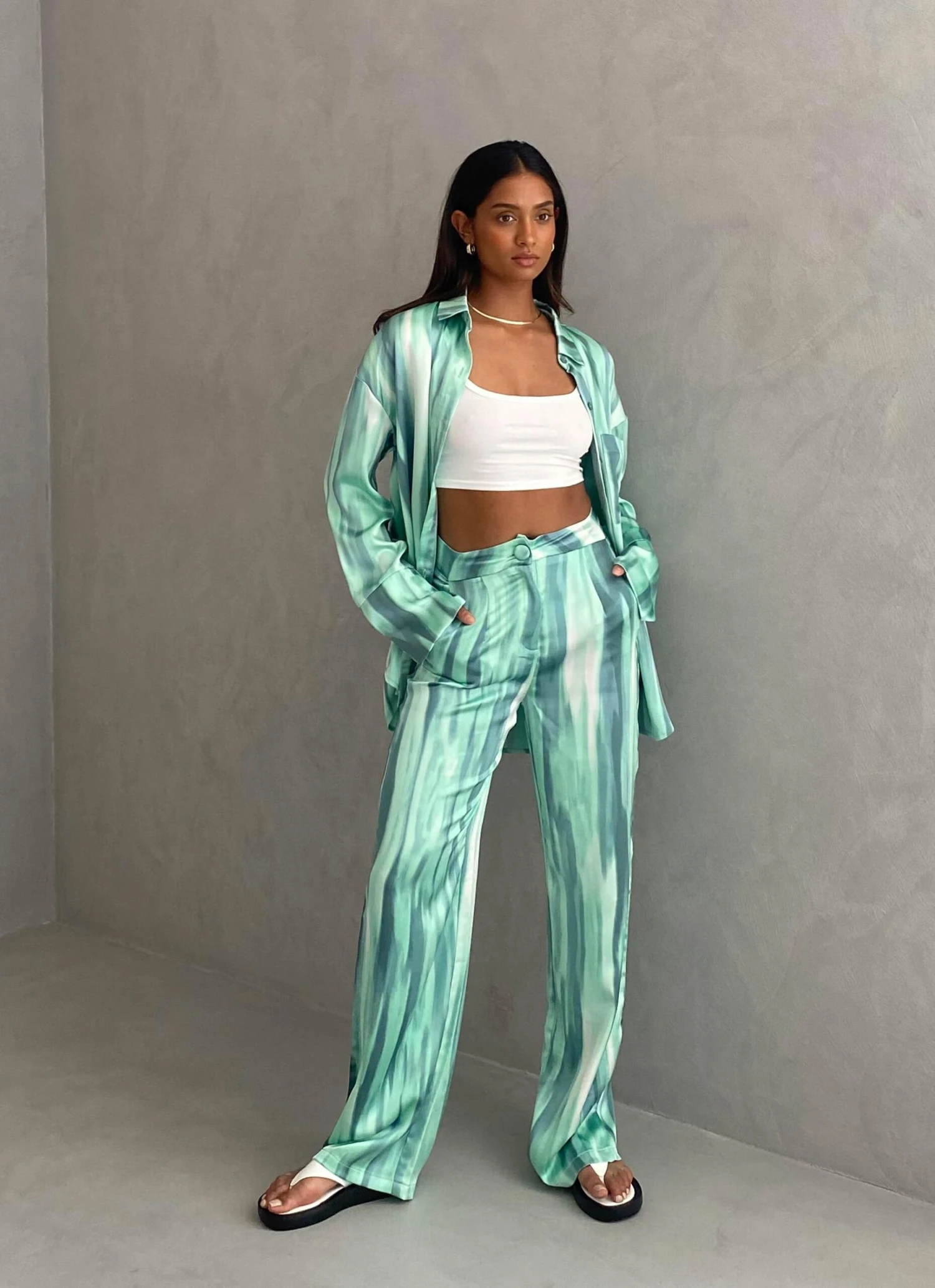 A style that makes a statement. Finished in this season’s bold prints, the Norma trouser has been brought to life in a dyed green watercolour effect for a vibrant design. Co-ordinate with the matching Norma trouser or wear with a bralet and sandals.