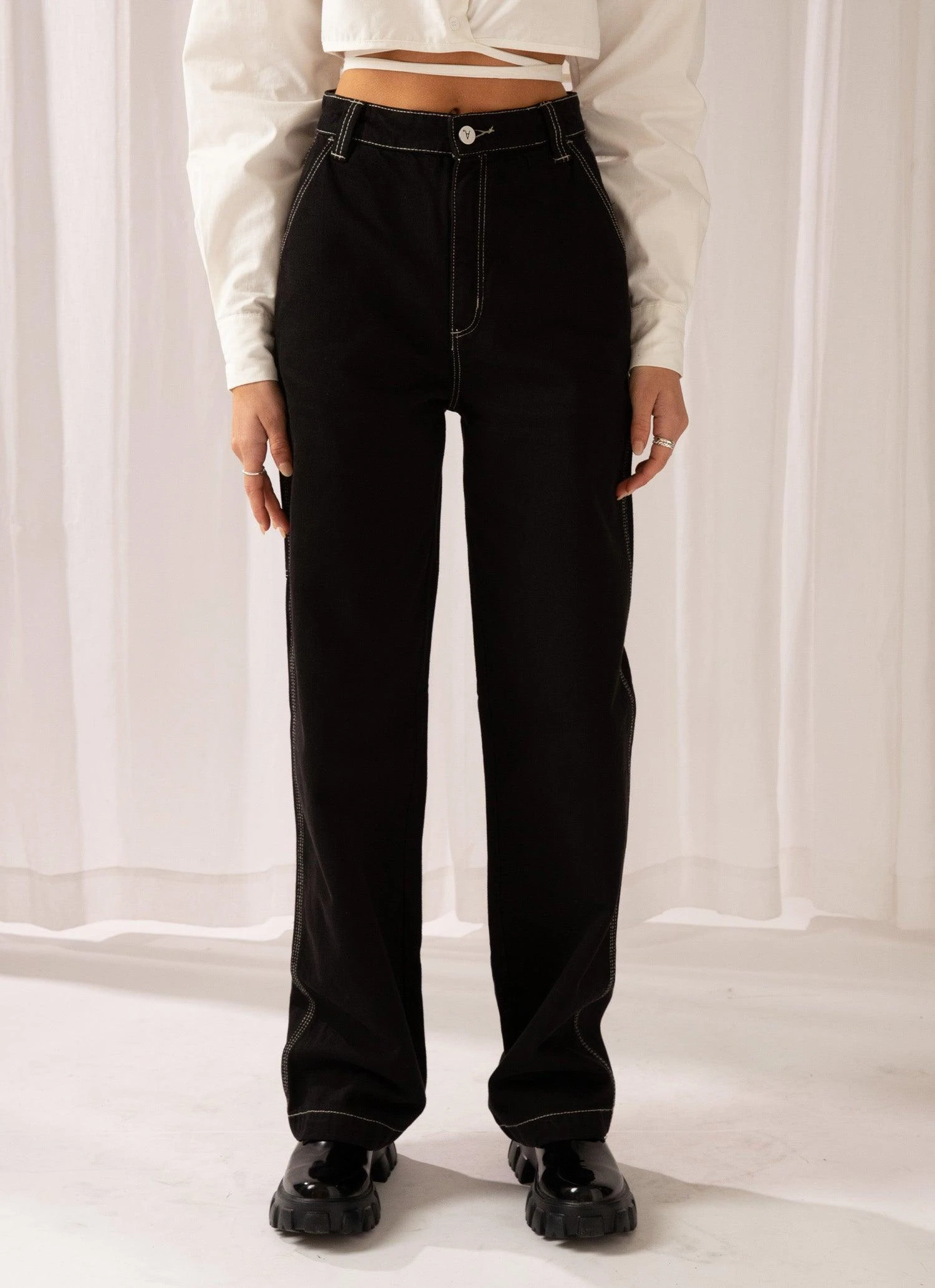 The A Carrie Carpenter Jeans by Abrand are a full length style that come in a subtly washed black denim. The jeans are a relaxed straight leg fit and feature a four pocket design, utility pocket at the side, belt loops, branded leather patch at the back, utility strap and high rise design. Carpenter detailing is in an off-white contrast stitch.
