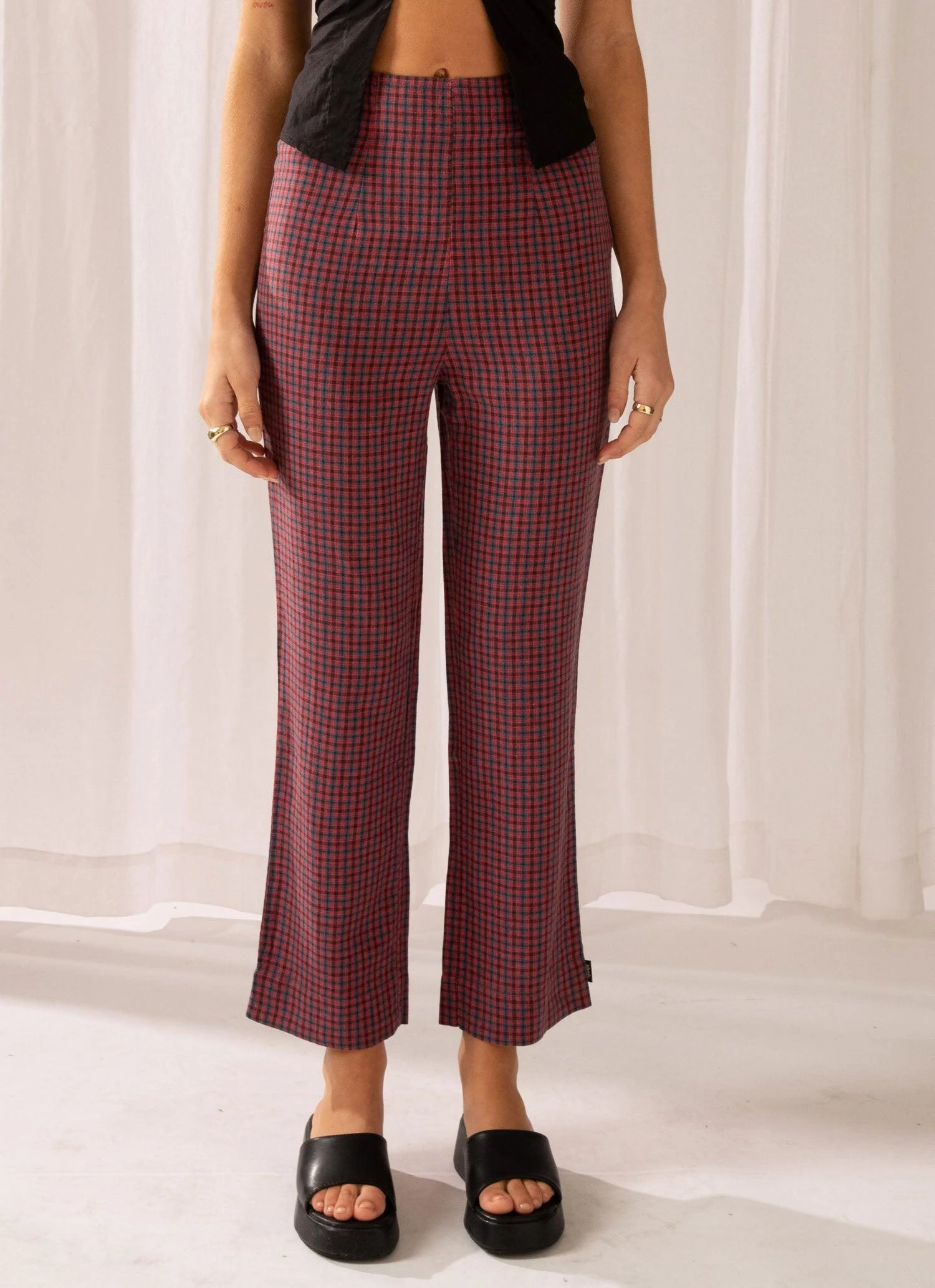 These high waisted pants check all the boxes. Following our classic high-waisted silhouette, these slim-fitting pants offer a seamless design with an invisible side zip entry. In the eco blend of hemp and tencel, these pants are lightweight, breathable and add a pop of colour in our custom red check print.