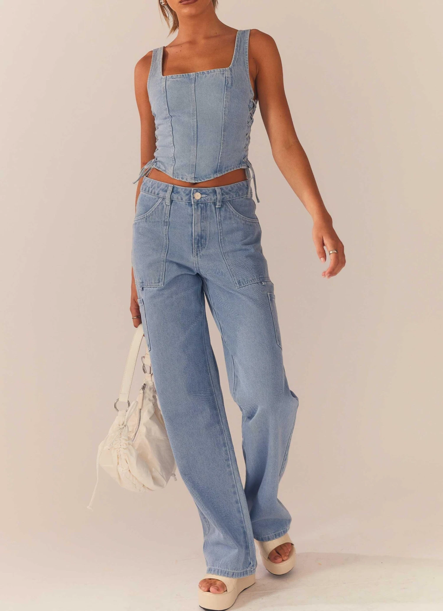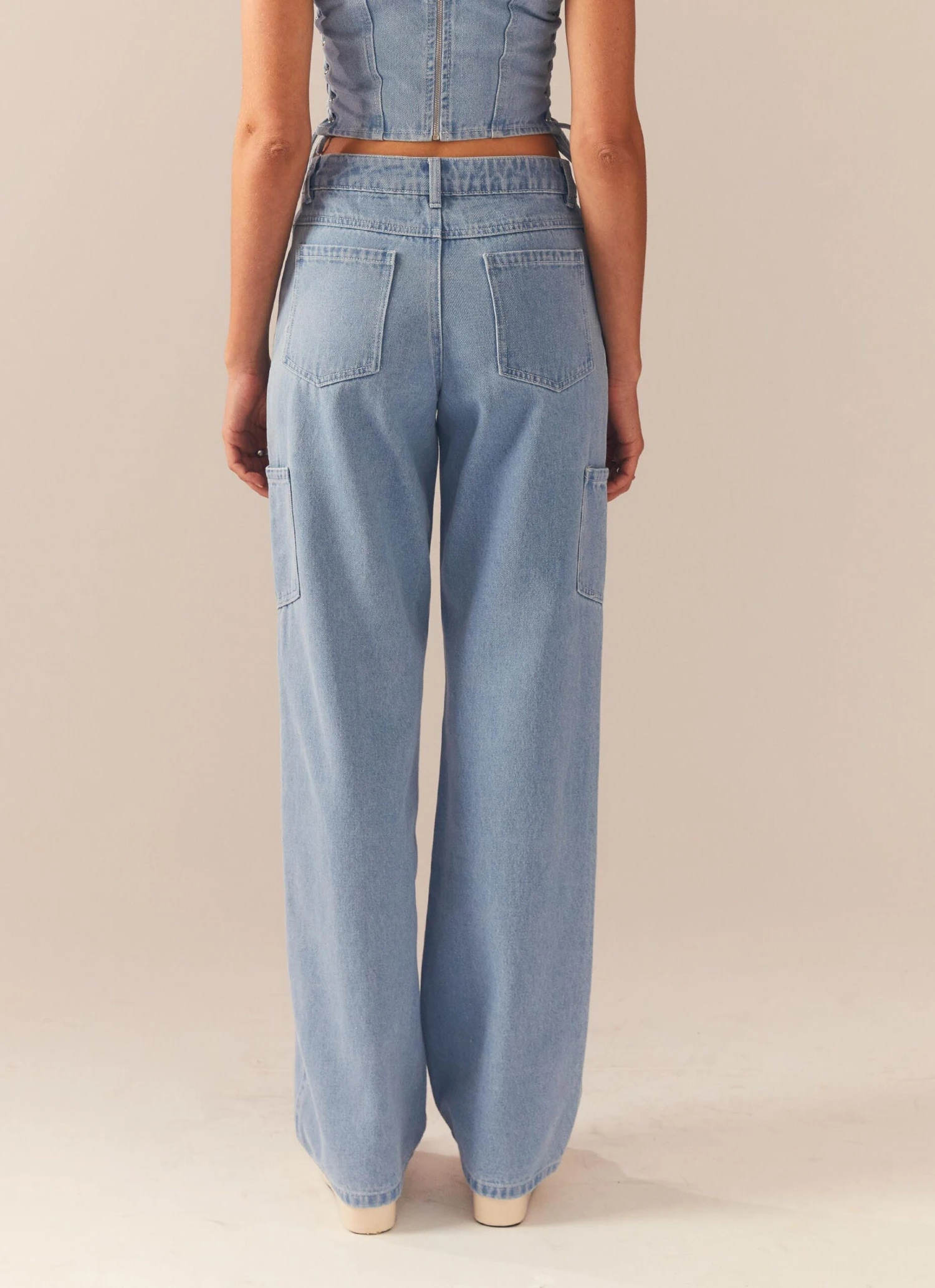 An absolute must have, the Backstage Pass Denim Low Rise Pants are a carpenter style pant made in a denim with a straight, wide leg fit and designed to be worn lower on the hips. The perfect jean to elevate any outfit.