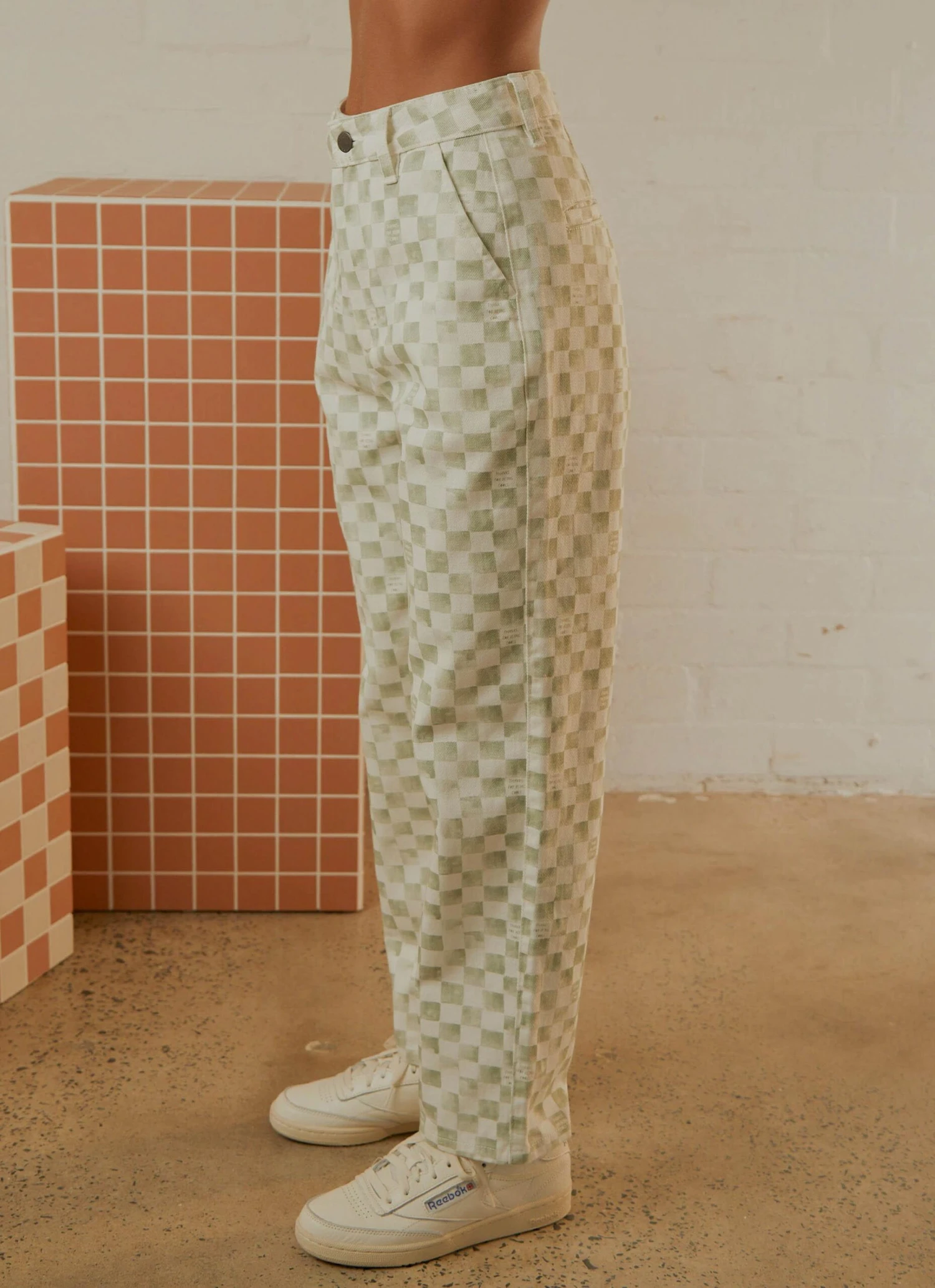 A wardrobe staple every cool girl needs. The California Pant are made of stretch cotton denim and has a soft checkered print in Sage.