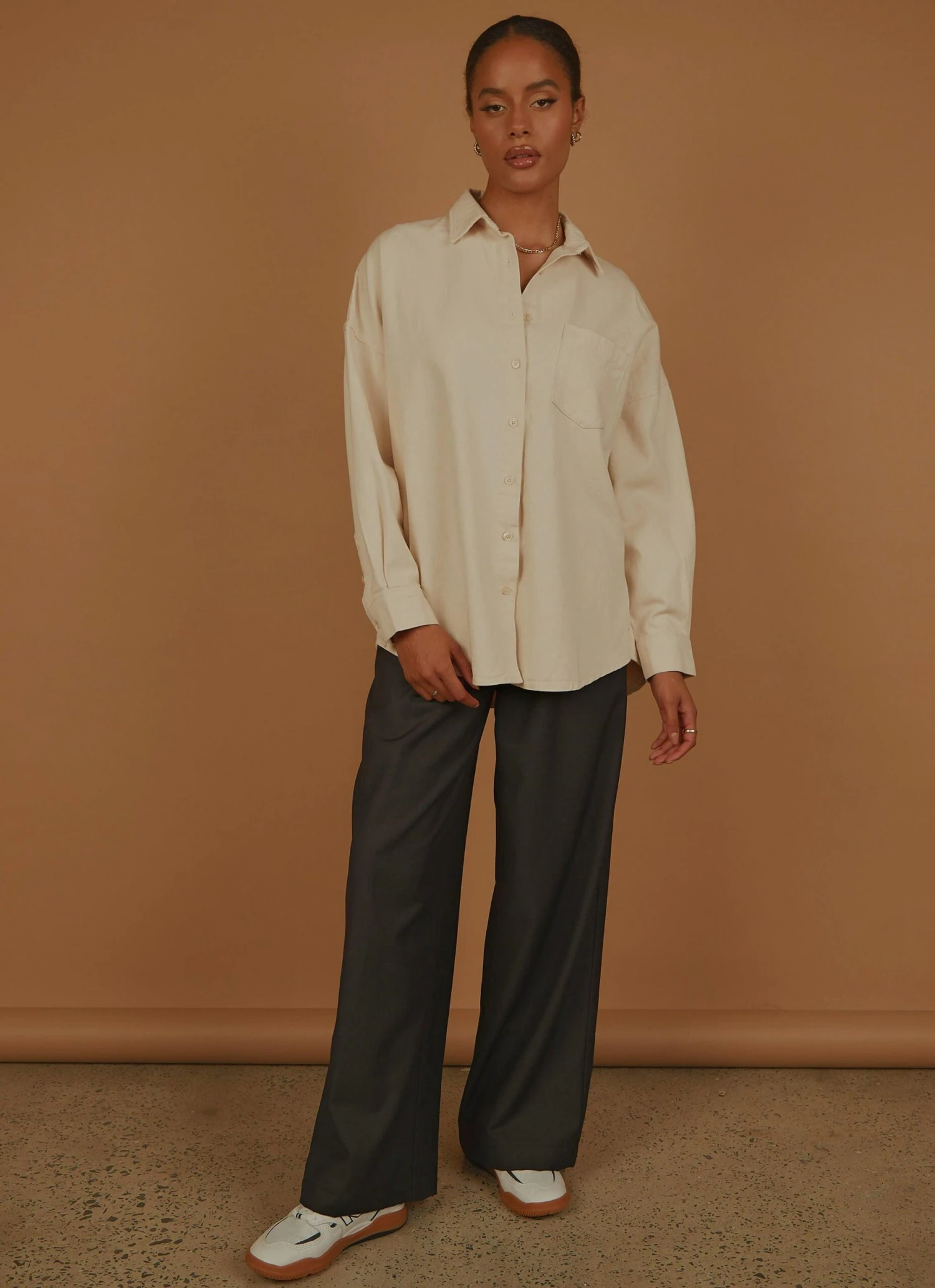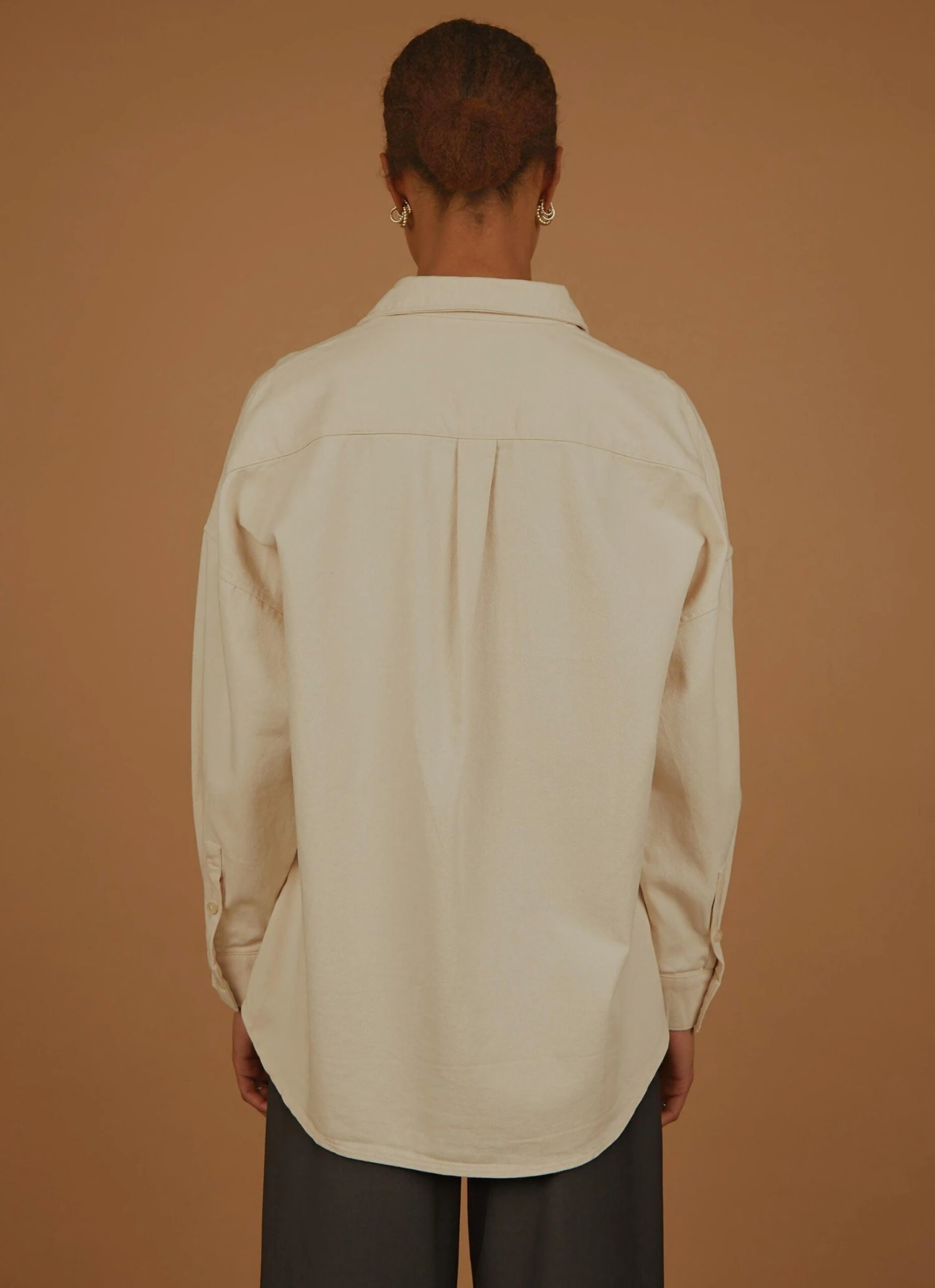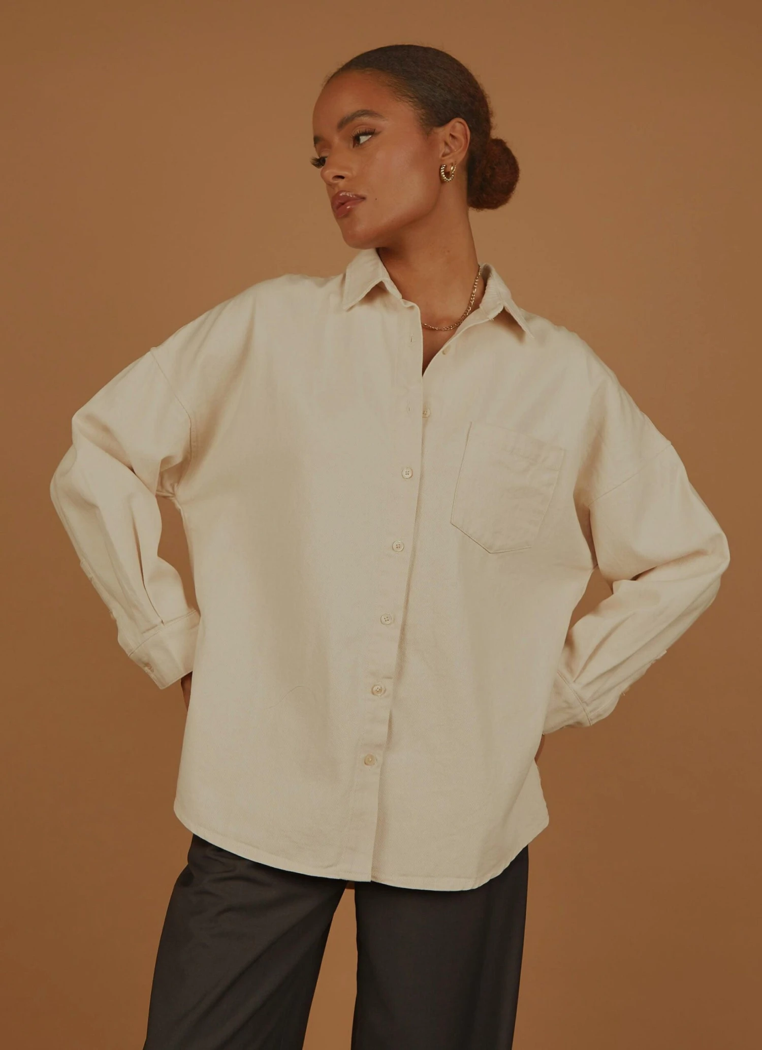 An everyday essential! Constructed in 100% heavyweight cotton twill, the Denver Shirt is a relaxed, slightly oversized fit with a scalloped hem sitting just below the hips. Classic shirting features include a collar with button front opening, front chest pocket and full length sleeves with cuff.