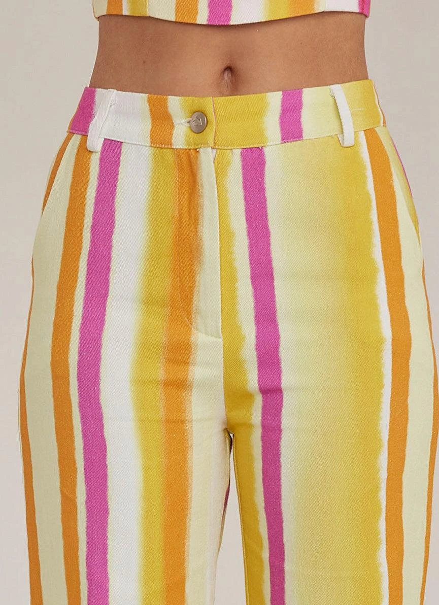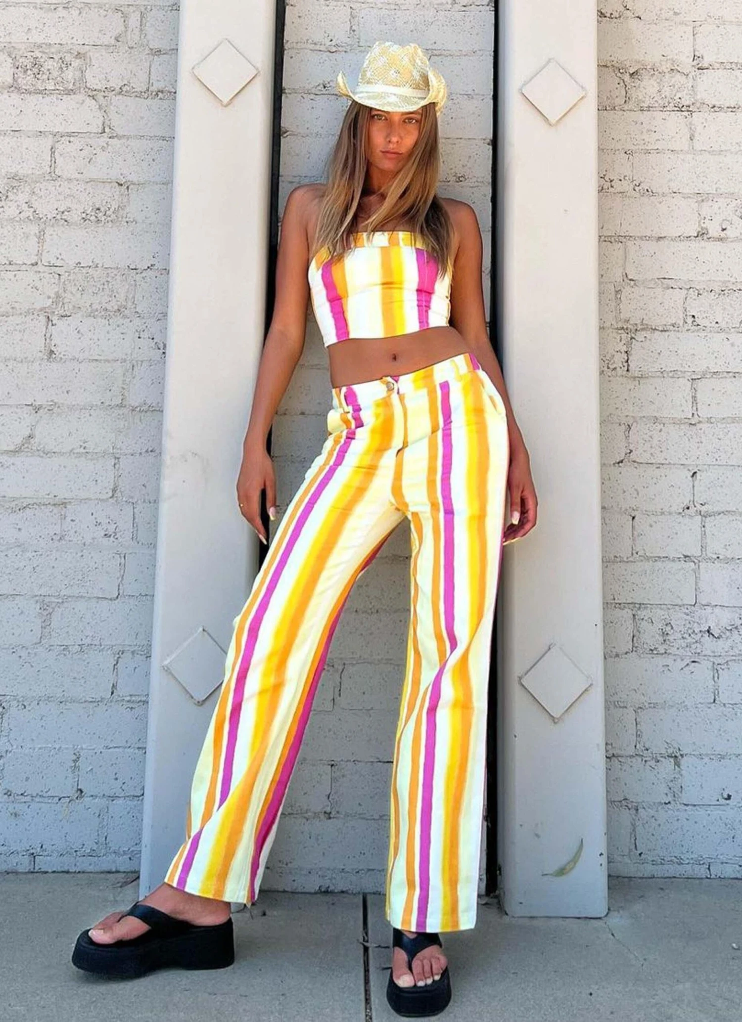 Obsessed is an understatement! The Estate Pants are a high waisted straight leg jean in our gorgeous Sunset Stripe print made of pink, orange and yellow hues. We love them paired back with a cropped tank and chunky gold jewellery.
