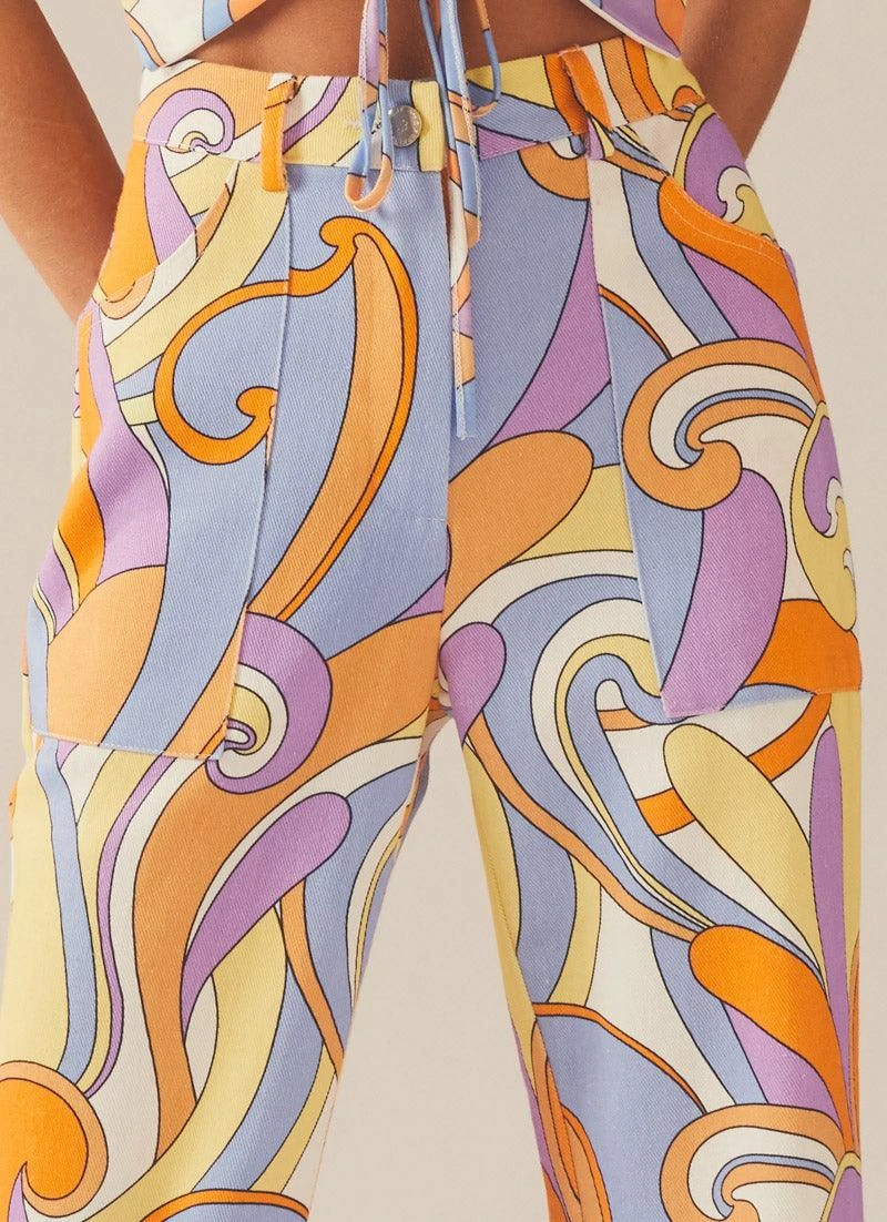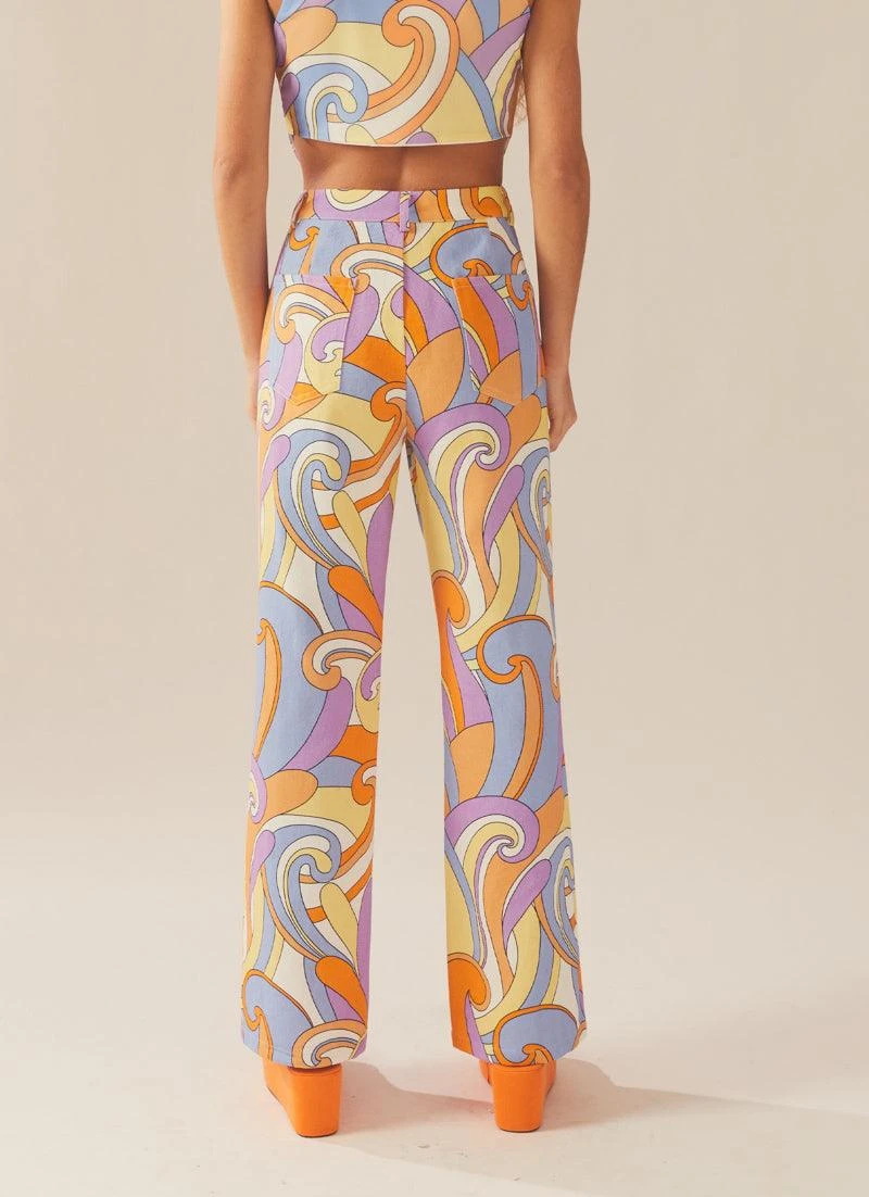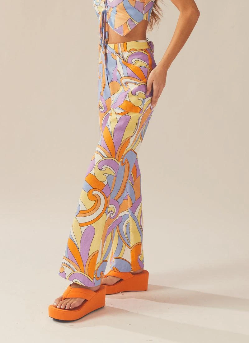 Groovy baby! The Evie Pants are a high waisted pant crafted in our exclusive Retro Swirl print. Guaranteed to turn some heads, we love them paired back with the Paradising Mesh Top for the perfect festival look.