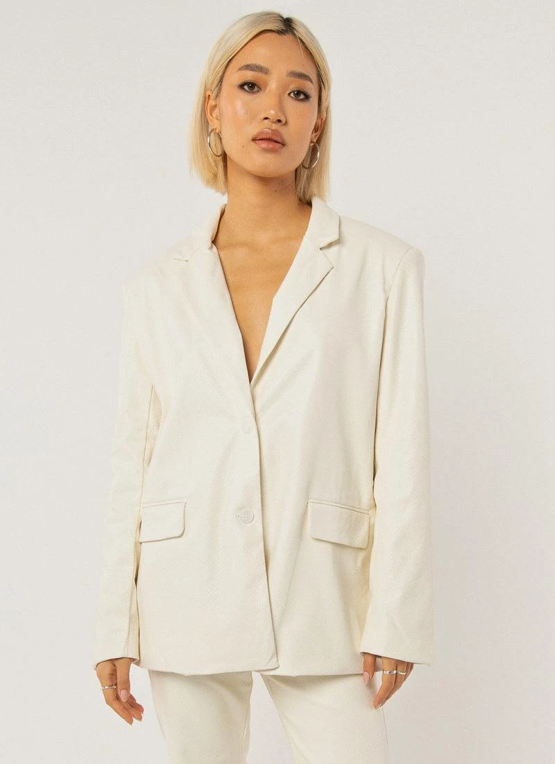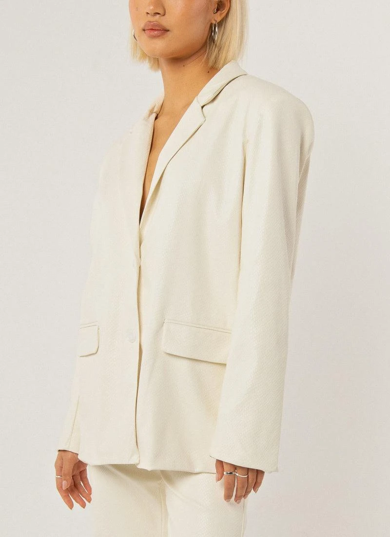 A whole vibe with the In The Mix Blazer, an oversized cut and crafted in a textured ivory snakeskin print. We love it layered over the Divine Energy Bustier and paired back with the To The Beat Pants or Love Of The Game Mini Skirt.