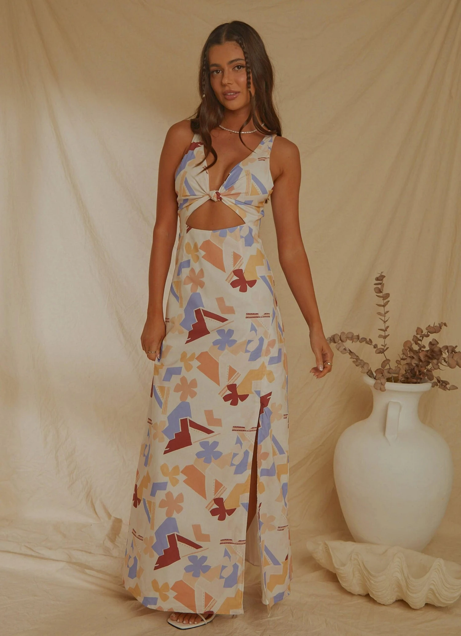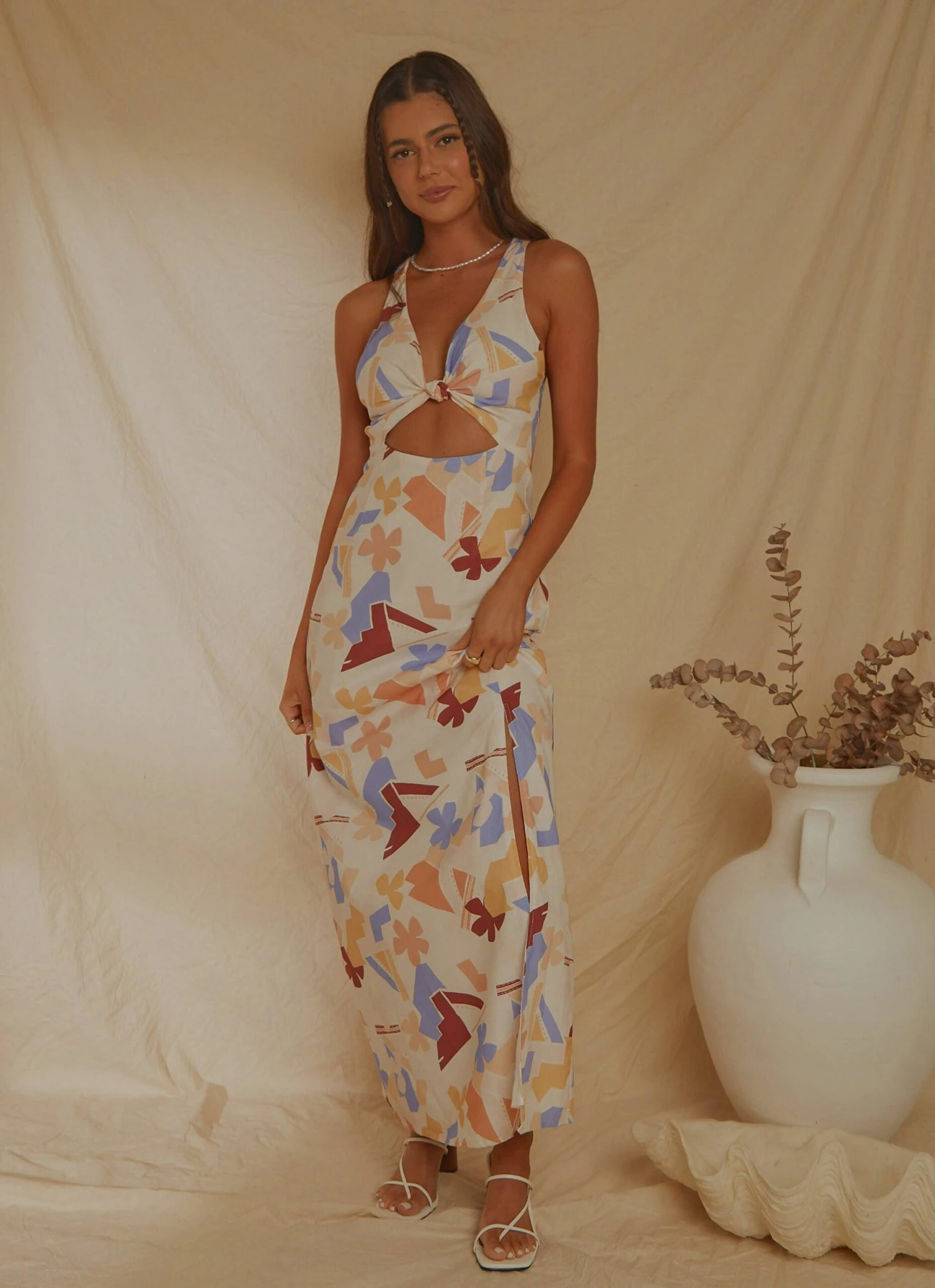 Your next summer vacay is calling and we’ve got the perf dress for it! The Holiday Sun Maxi Dress features a soft abstract print and cut out styling under the bust with elasticised ruched straps that cross between the shoulder blades. Add a statement earring and your fave heels for cocktail o’clock!