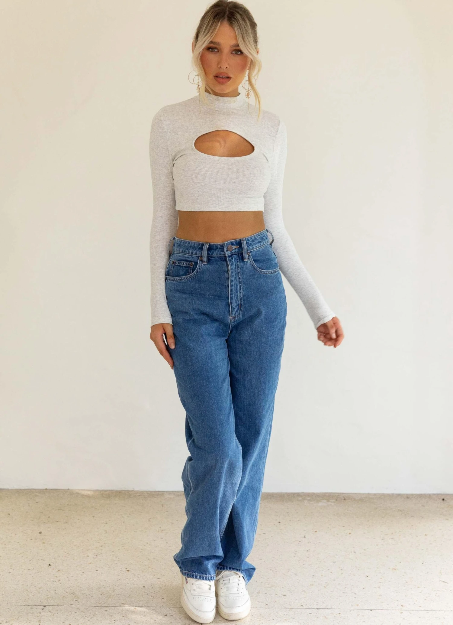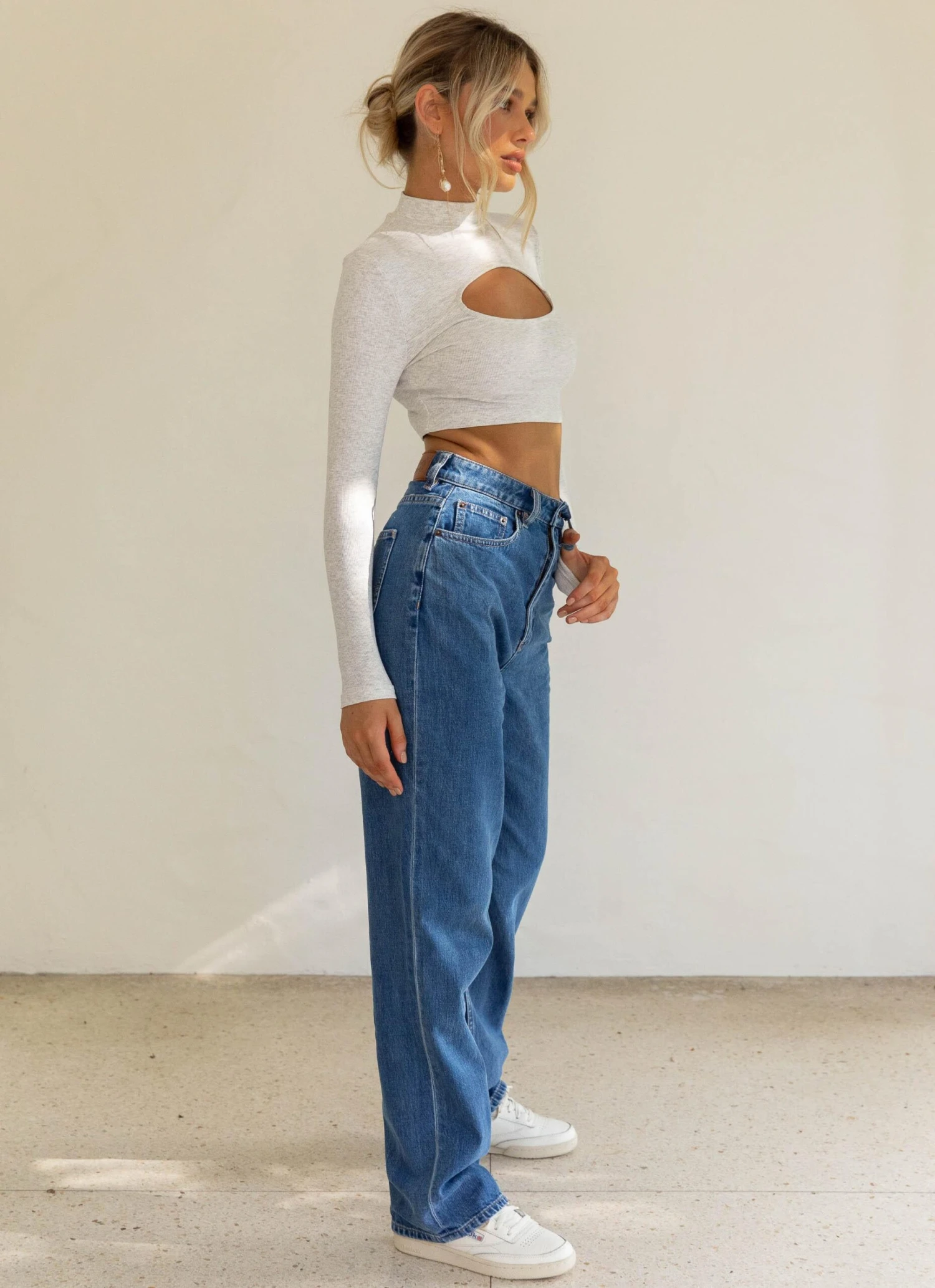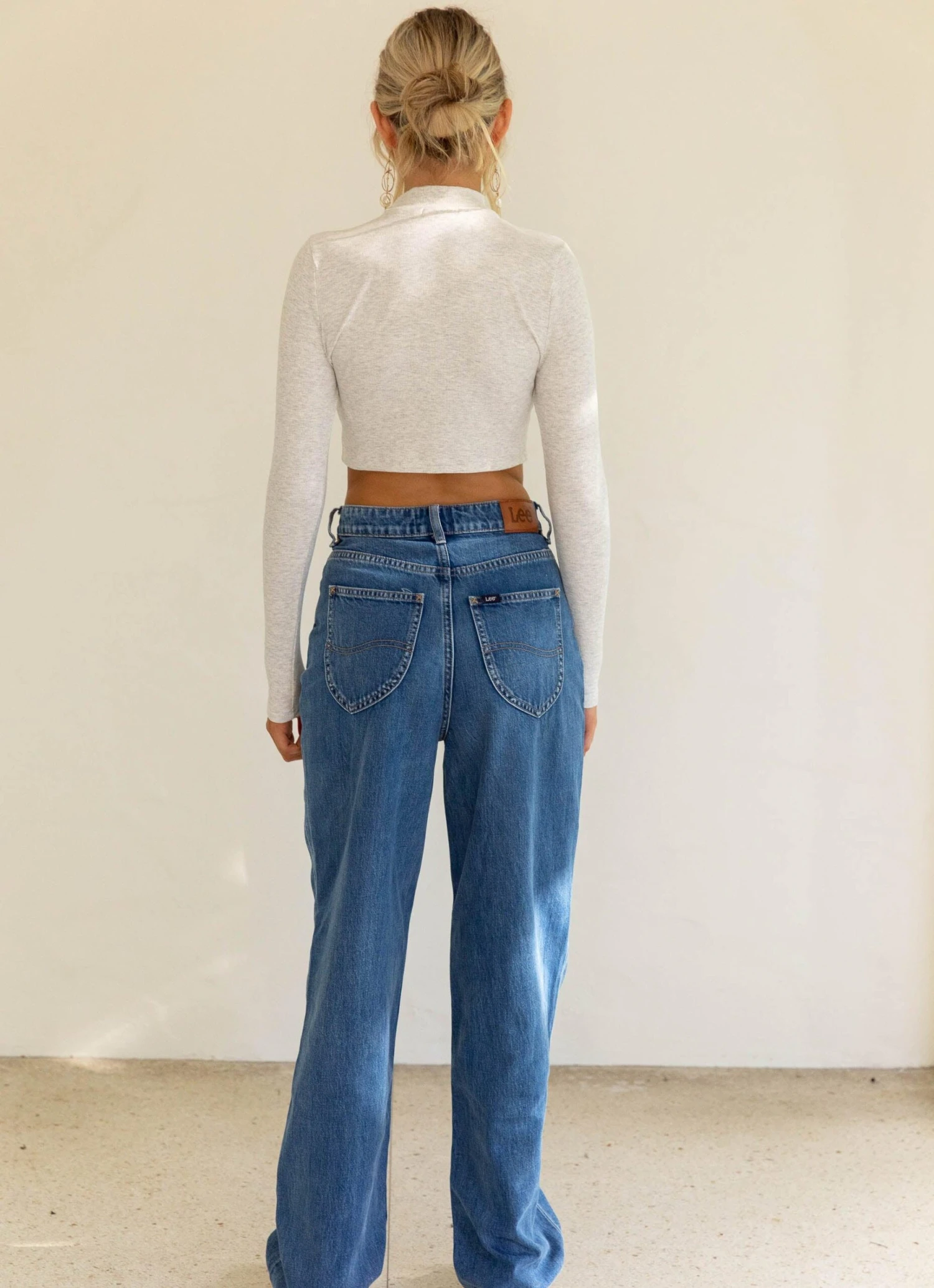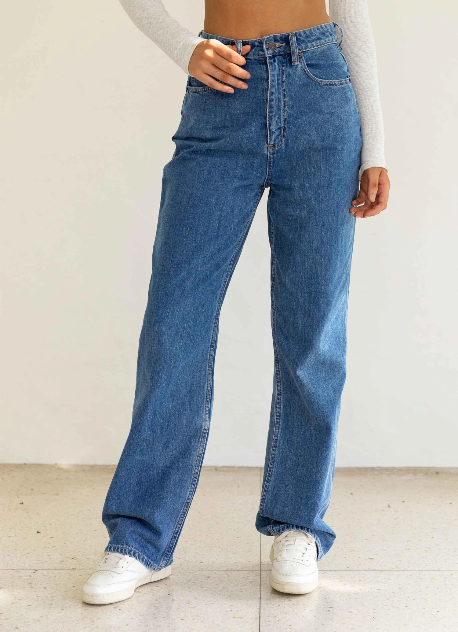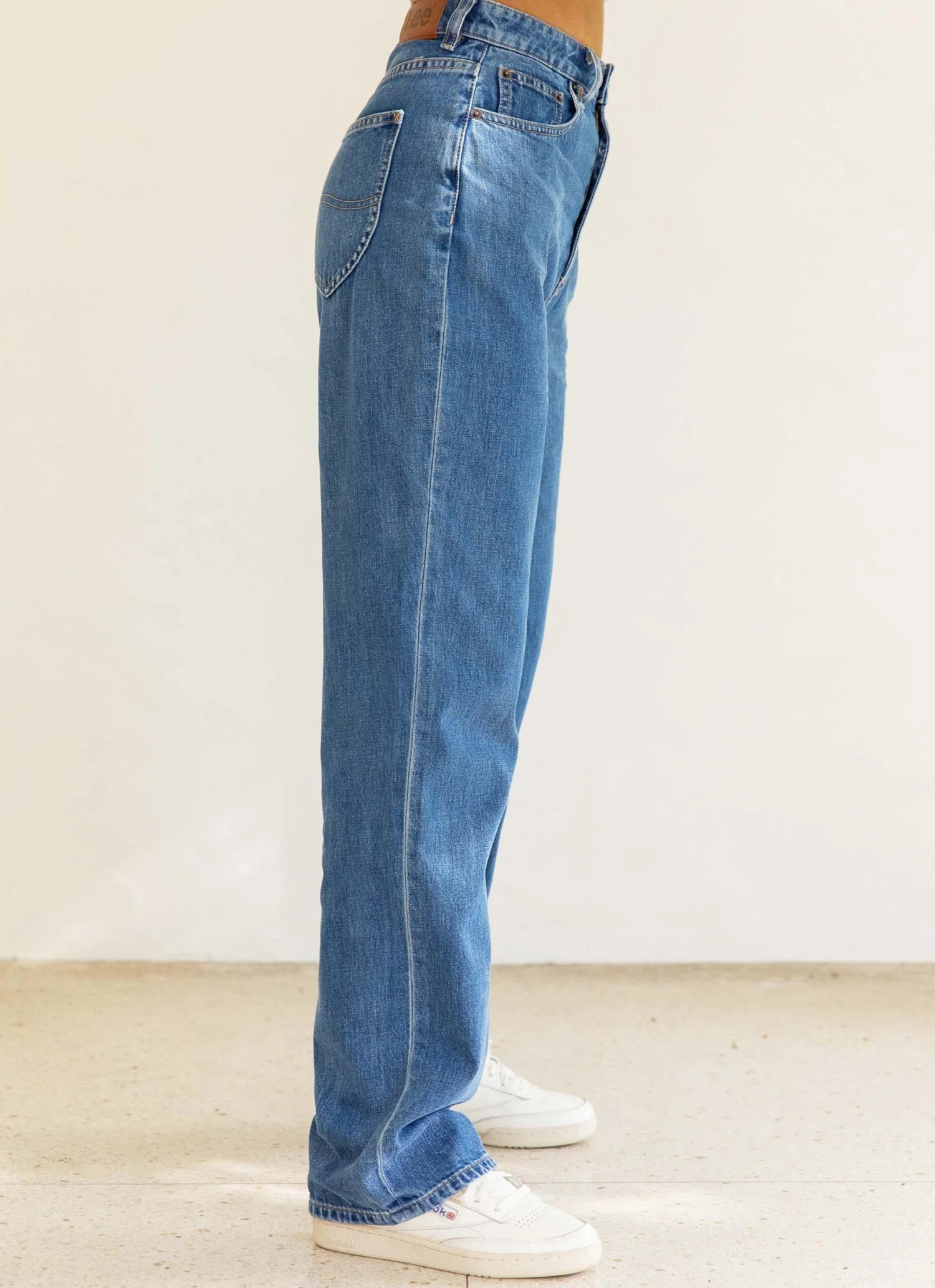 Our coveted High Baggy is high rise, sitting comfortably on your waist, relaxed through the seat and thigh, with a full leg profile. Style with anything from sneakers to heels, these jeans are the ultimate in versatility. Future Blue wash features a mid-blue stonewash with authentic high twill, rigid denim for a subtle worn-in appearance.