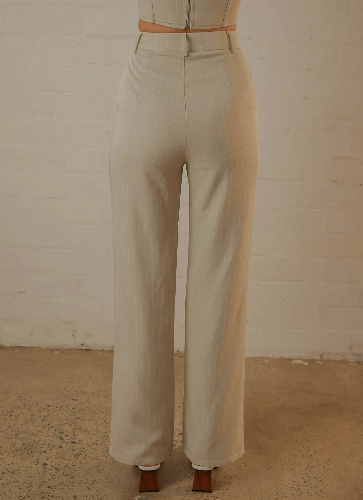 We’ve got the answer to all your pant prayers! Say hello the the Mia Suit Pant. Designed to be worn high on the hips in our soft Stone Pinstripe Print featuring 2 pocket detailing at the front and back darts for tailoring. Elevate your look and style it with the Mia Suit Bustier, layered with the Mia Oversized Blazer.