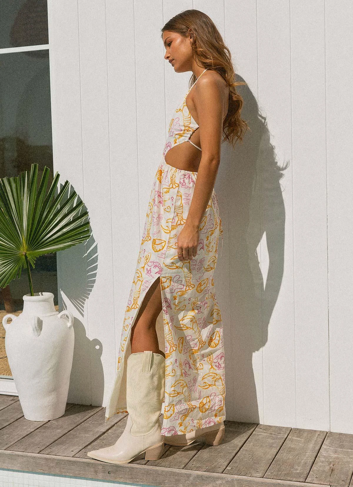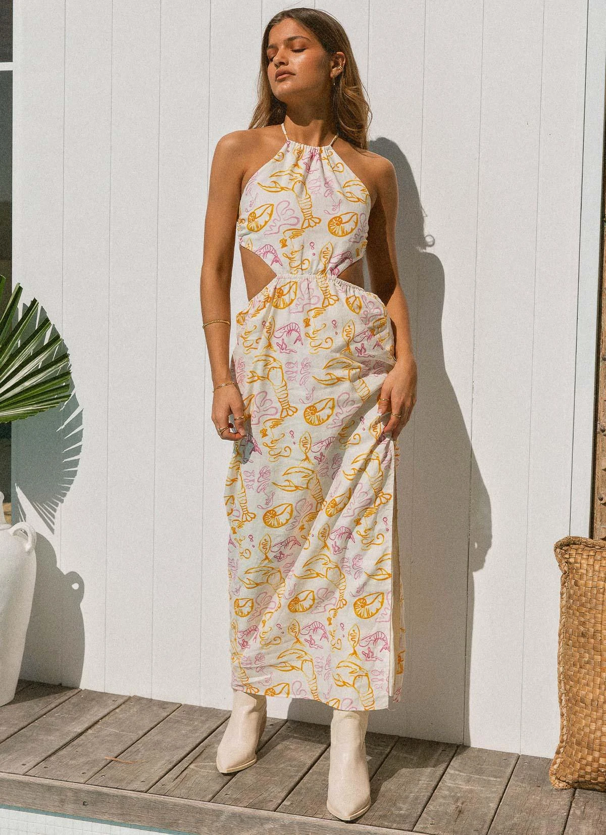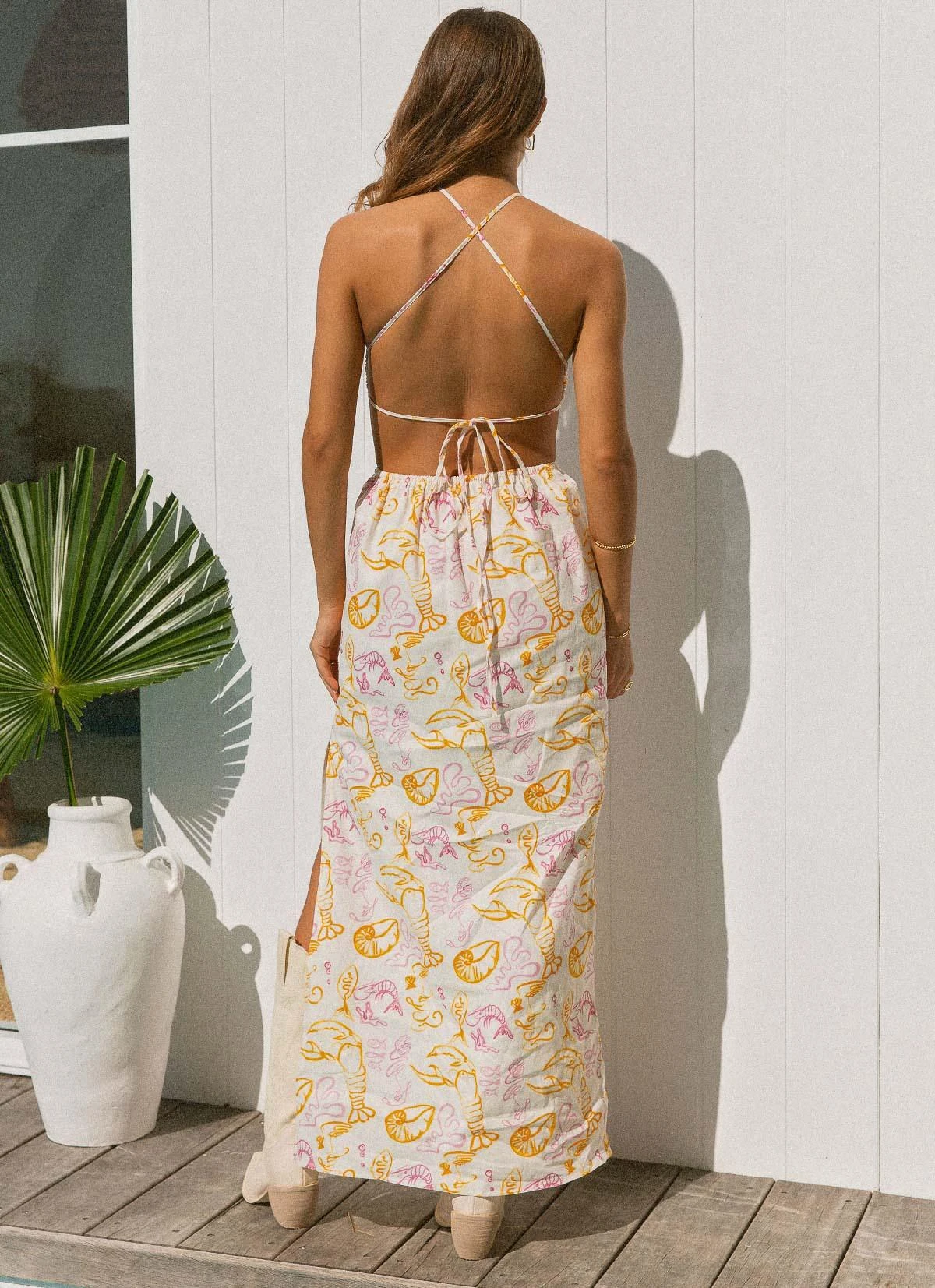 Made for cocktail o’clock! The Oysters and Prosecco Linen Maxi Dress is a halterneck style that has flattering cut out detailing at the sides of the body with functioning drawstring at the neck and sides. Crafted from light linen with a split on the left leg and featuring our exclusive Peppermayo x Rikki Day print, this dress was made for summer vacay. Style with an Aperol spritz in hand.
