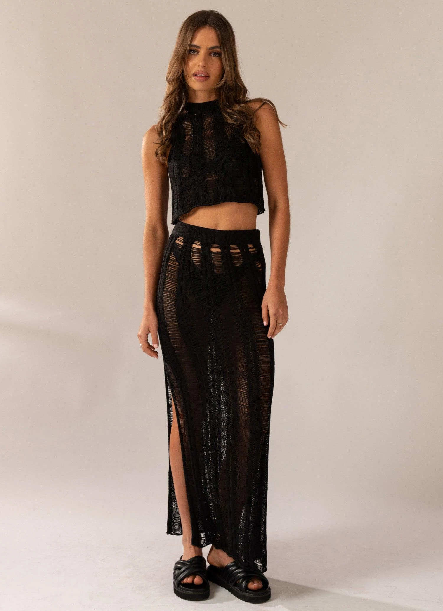 Festival ready! The Perri Ladder Knit Tank ticks all the festival fit boxes with its cute cropped length, crew neck and ladder knit fabrication. Layer it over swimwear and pair it back with the Perri Ladder Knit Skirt and boots.