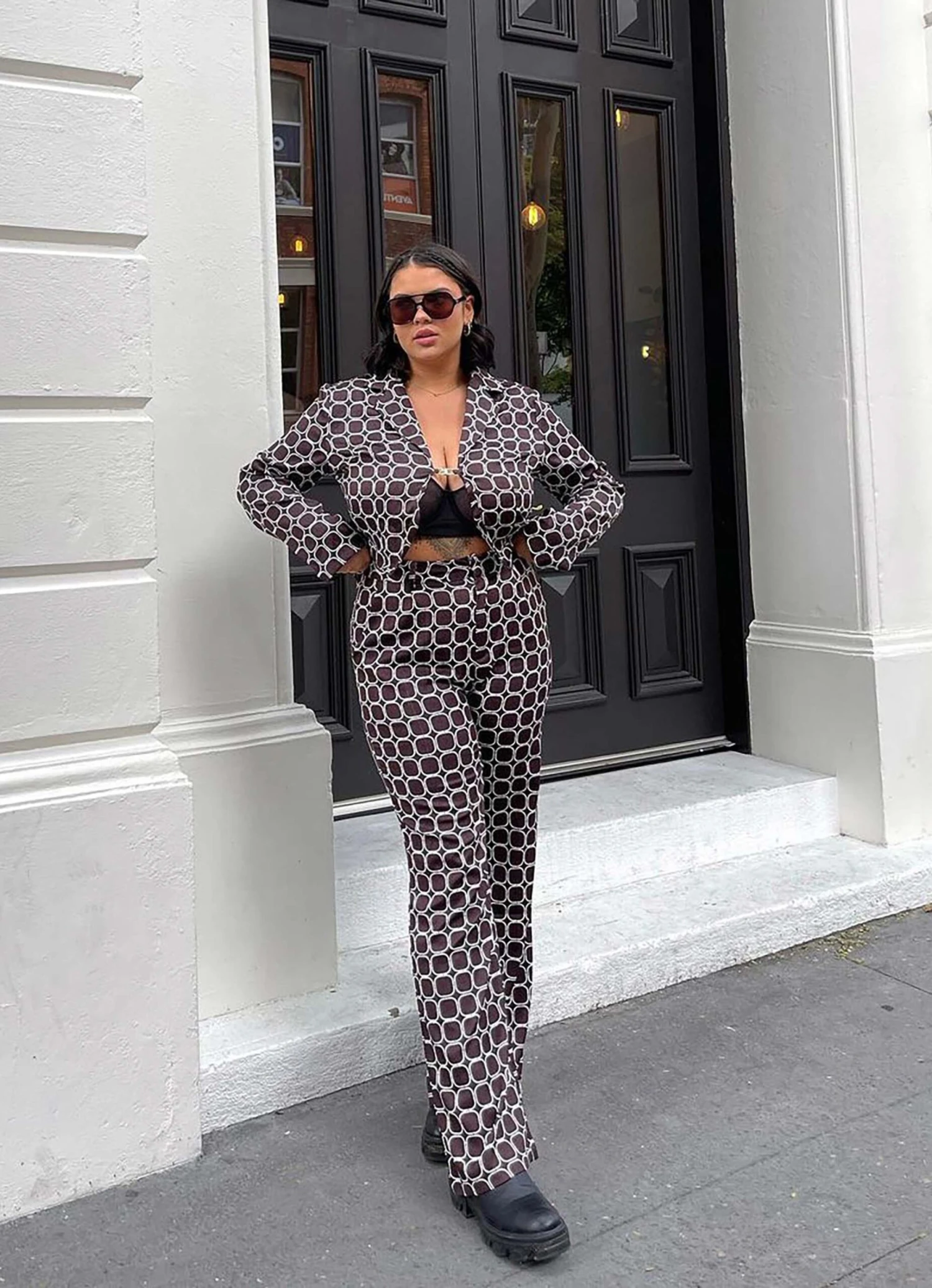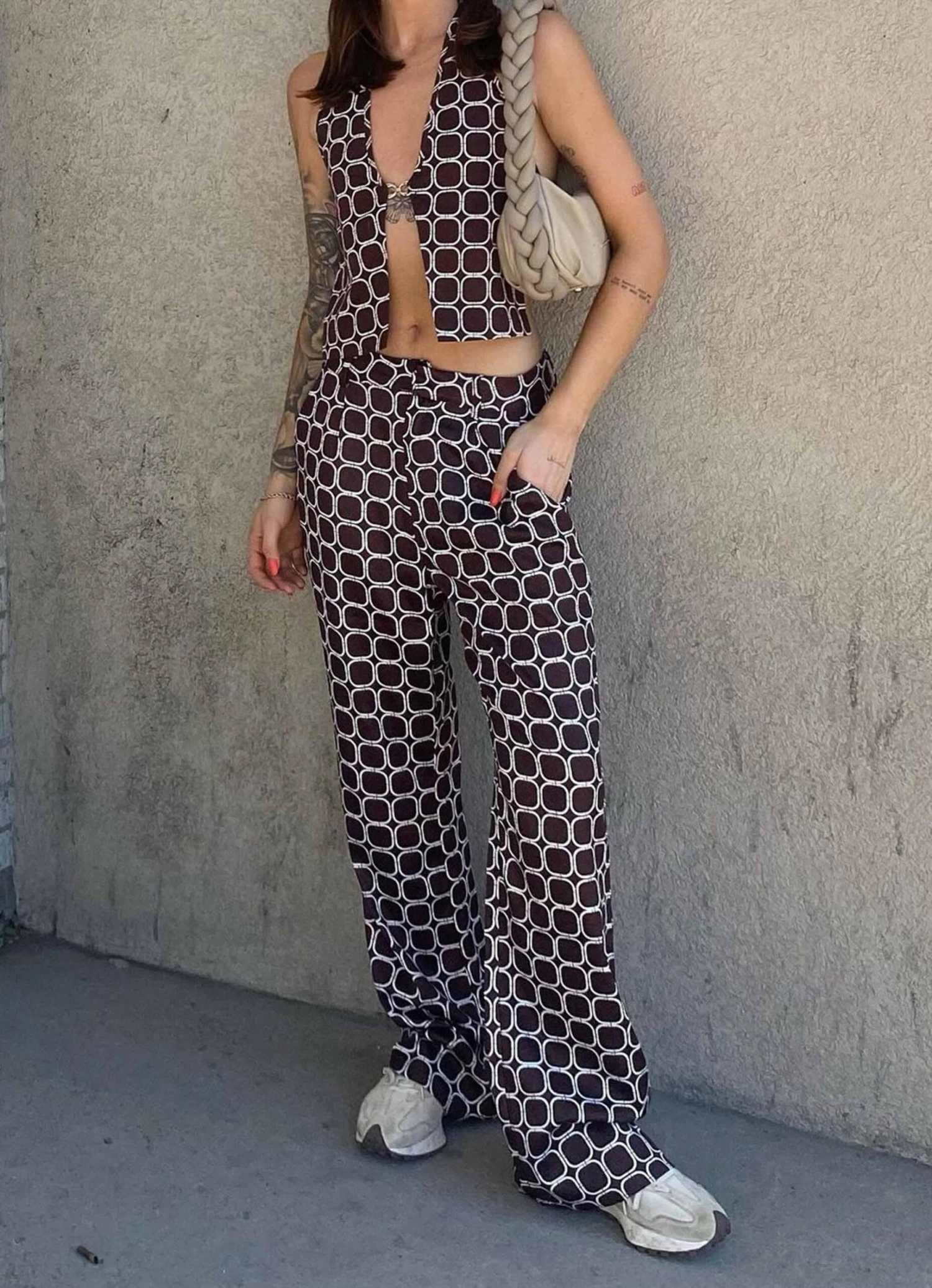 The ultimate boss babe look! The Romeo Pant features a groovy geometric print with 2 pocket detailing and fastened waisted with belt loops. Bring the heat and pair them with Cobain Crop Shirt and mules.
