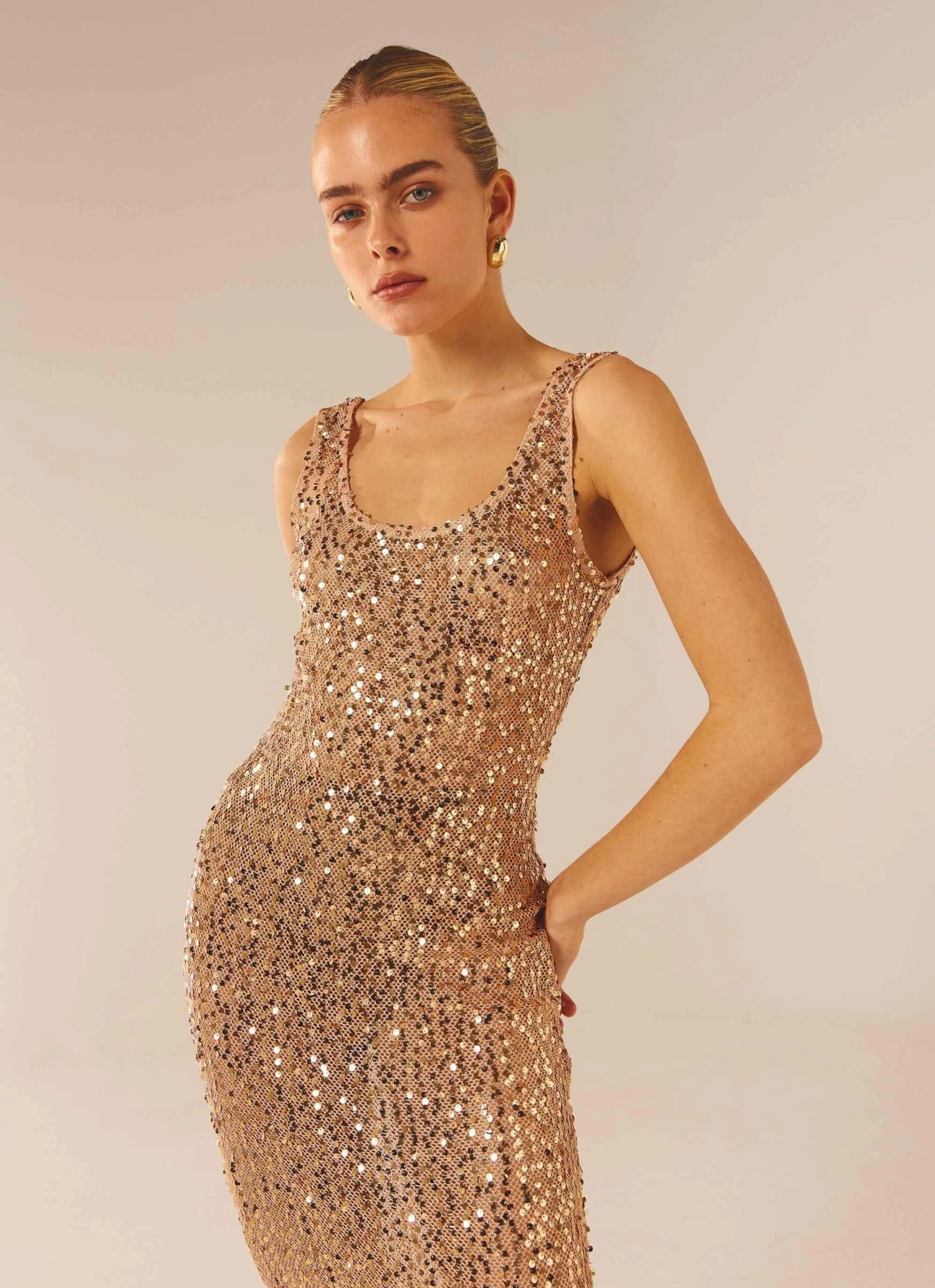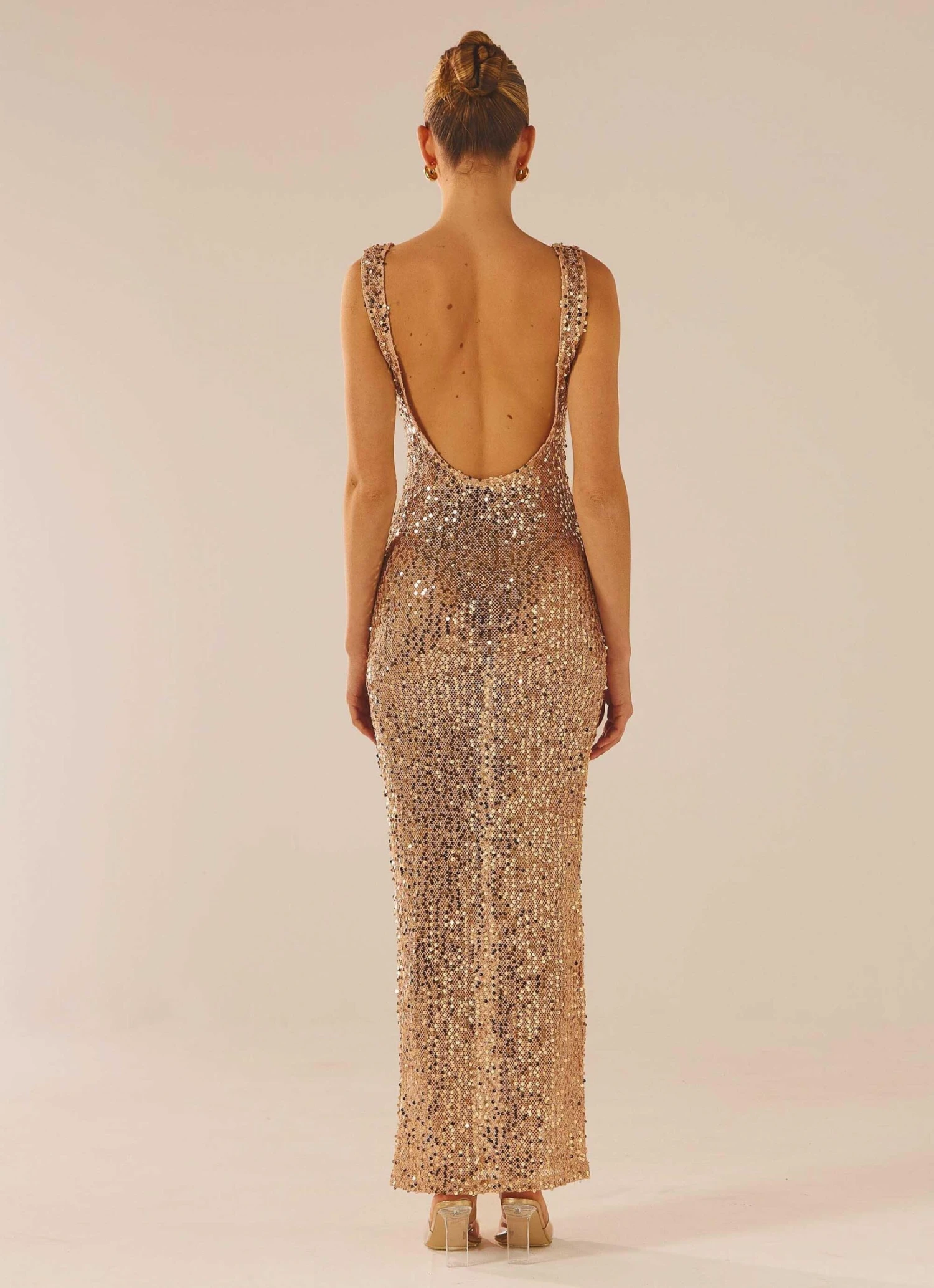 A statement piece for your wardrobe. The Sweet Essence Maxi Dress features a scoop neckline and slim, maxi fit. Wear front on for a standard fit or backwards for a deeper scoop neck. Made to sparkle, this dress looks perfect dressed up with some heels and blazer or paired with a bikini and worn backwards for a beach club fit.